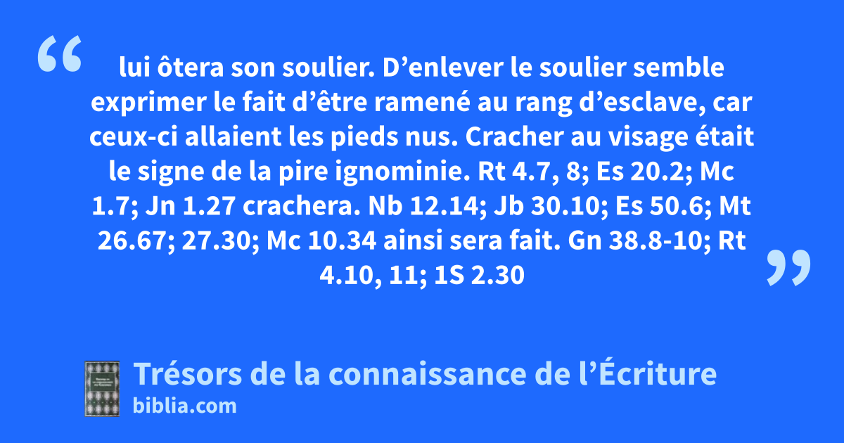 lui ôtera son soulier. D’enlever le soulier semble exprimer le fait d’être ramené au rang d’esclave, car ceux-ci allaient les pieds nus. Cracher au visage était le signe de la pire ignominie. Rt 4.7, 8; Es 20.2; Mc 1.7; Jn 1.27 crachera. Nb 12.14; Jb 30.10; Es 50.6; Mt 26.67; 27.30; Mc 10.34 ainsi sera fait. Gn 38.8-10; Rt 4.10, 11; 1S 2.30