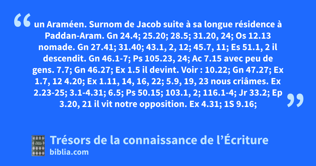 un Araméen. Surnom de Jacob suite à sa longue résidence à Paddan-Aram. Gn 24.4; 25.20; 28.5; 31.20, 24; Os 12.13 nomade. Gn 27.41; 31.40; 43.1, 2, 12; 45.7, 11; Es 51.1, 2 il descendit. Gn 46.1-7; Ps 105.23, 24; Ac 7.15 avec peu de gens. 7.7; Gn 46.27; Ex 1.5 il devint. Voir : 10.22; Gn 47.27; Ex 1.7, 12