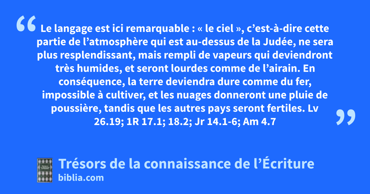 Le langage est ici remarquable : « le ciel », c’est-à-dire cette partie de l’atmosphère qui est au-dessus de la Judée, ne sera plus resplendissant, mais rempli de vapeurs qui deviendront très humides, et seront lourdes comme de l’airain. En conséquence, la terre deviendra dure comme du fer, impossible à cultiver, et les nuages donneront une pluie de poussière, tandis que les autres pays seront fertiles. Lv 26.19; 1R 17.1; 18.2; Jr 14.1-6; Am 4.7