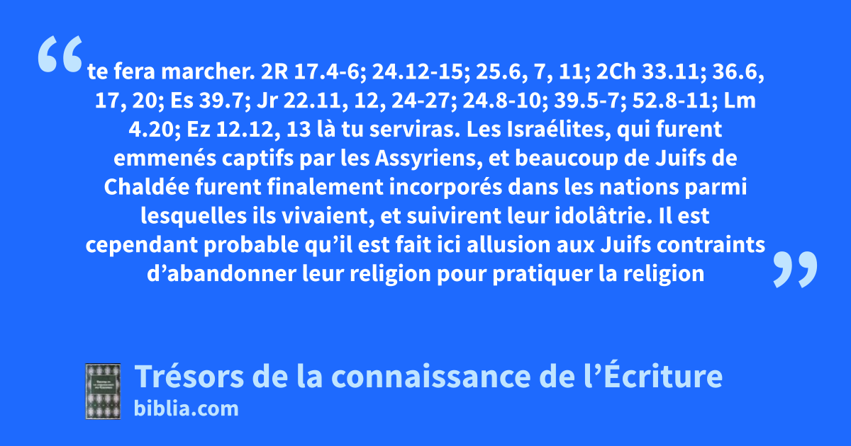 te fera marcher. 2R 17.4-6; 24.12-15; 25.6, 7, 11; 2Ch 33.11; 36.6, 17, 20; Es 39.7; Jr 22.11, 12, 24-27; 24.8-10; 39.5-7; 52.8-11; Lm 4.20; Ez 12.12, 13 là tu serviras. Les Israélites, qui furent emmenés captifs par les Assyriens, et beaucoup de Juifs de Chaldée furent finalement incorporés dans les nations parmi lesquelles ils vivaient, et suivirent leur idolâtrie. Il est cependant probable qu’il est fait ici allusion aux Juifs contraints d’abandonner leur religion pour pratiquer la religion du pays où ils étaient. 64 Voir : 4.28; Jr 16.13; Ez 20.32, 33, 39
