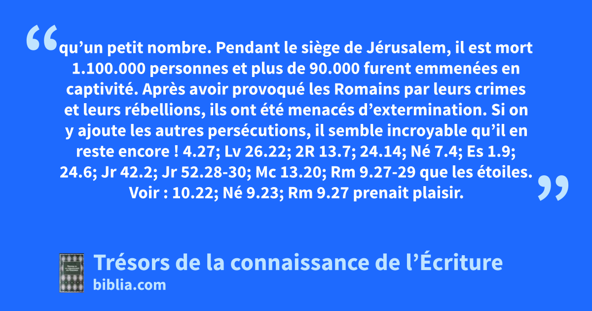 qu’un petit nombre. Pendant le siège de Jérusalem, il est mort 1.100.000 personnes et plus de 90.000 furent emmenées en captivité. Après avoir provoqué les Romains par leurs crimes et leurs rébellions, ils ont été menacés d’extermination. Si on y ajoute les autres persécutions, il semble incroyable qu’il en reste encore ! 4.27; Lv 26.22; 2R 13.7; 24.14; Né 7.4; Es 1.9; 24.6; Jr 42.2; Jr 52.28-30; Mc 13.20; Rm 9.27-29 que les étoiles. Voir : 10.22; Né 9.23; Rm 9.27
