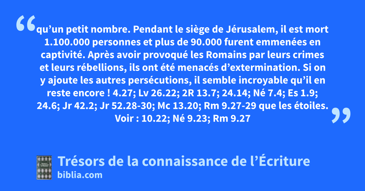 qu’un petit nombre. Pendant le siège de Jérusalem, il est mort 1.100.000 personnes et plus de 90.000 furent emmenées en captivité. Après avoir provoqué les Romains par leurs crimes et leurs rébellions, ils ont été menacés d’extermination. Si on y ajoute les autres persécutions, il semble incroyable qu’il en reste encore ! 4.27; Lv 26.22; 2R 13.7; 24.14; Né 7.4; Es 1.9; 24.6; Jr 42.2; Jr 52.28-30; Mc 13.20; Rm 9.27-29 que les étoiles. Voir : 10.22; Né 9.23; Rm 9.27