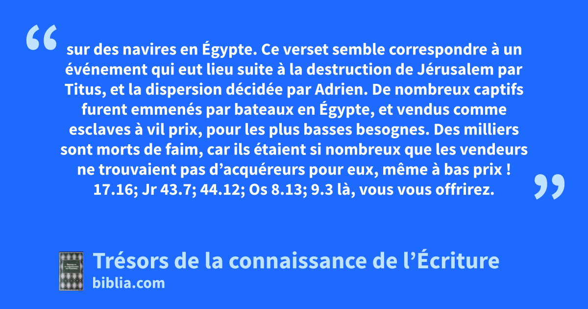 sur des navires en Égypte. Ce verset semble correspondre à un événement qui eut lieu suite à la destruction de Jérusalem par Titus, et la dispersion décidée par Adrien. De nombreux captifs furent emmenés par bateaux en Égypte, et vendus comme esclaves à vil prix, pour les plus basses besognes. Des milliers sont morts de faim, car ils étaient si nombreux que les vendeurs ne trouvaient pas d’acquéreurs pour eux, même à bas prix ! 17.16; Jr 43.7; 44.12; Os 8.13; 9.3 là, vous vous offrirez. Ex 20.2; Né 5.8; Est 7.4; Jl 3.3-7; Lc 21.24