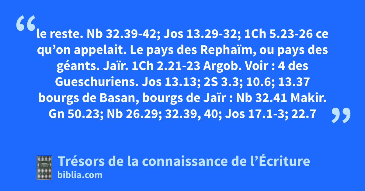 le reste. Nb 32.39-42; Jos 13.29-32; 1Ch 5.23-26 ce qu’on appelait. Le pays des Rephaïm, ou pays des géants.