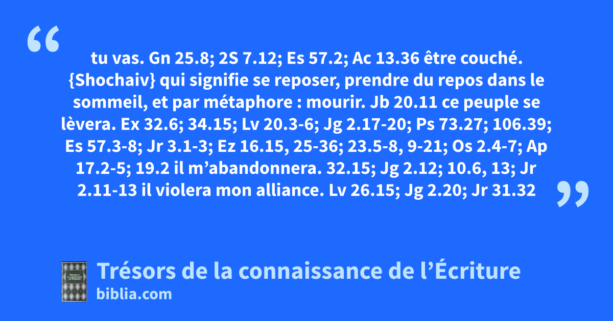 tu vas. Gn 25.8; 2S 7.12; Es 57.2; Ac 13.36 être couché. {Shochaiv} qui signifie se reposer, prendre du repos dans le sommeil, et par métaphore : mourir. Jb 20.11 ce peuple se lèvera. Ex 32.6; 34.15; Lv 20.3-6; Jg 2.17-20; Ps 73.27; 106.39; Es 57.3-8; Jr 3.1-3; Ez 16.15, 25-36; 23.5-8, 9-21; Os 2.4-7; Ap 17.2-5; 19.2 il m’abandonnera. 32.15; Jg 2.12; 10.6, 13; Jr 2.11-13 il violera mon alliance. Lv 26.15; Jg 2.20; Jr 31.32