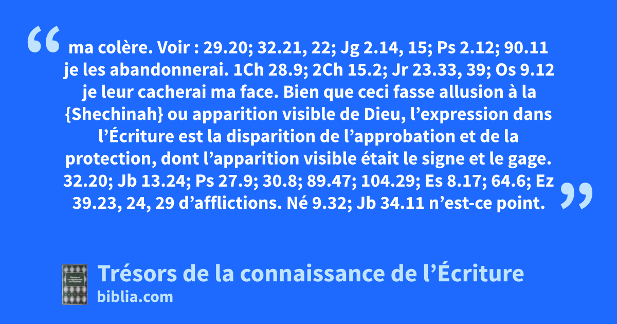 ma colère. Voir : 29.20; 32.21, 22; Jg 2.14, 15; Ps 2.12; 90.11 je les abandonnerai. 1Ch 28.9; 2Ch 15.2; Jr 23.33, 39; Os 9.12 je leur cacherai ma face. Bien que ceci fasse allusion à la {Shechinah} ou apparition visible de Dieu, l’expression dans l’Écriture est la disparition de l’approbation et de la protection, dont l’apparition visible était le signe et le gage. 32.20; Jb 13.24; Ps 27.9; 30.8; 89.47; 104.29; Es 8.17; 64.6; Ez 39.23, 24, 29 d’afflictions. Né 9.32; Jb 34.11 n’est-ce point. Voir : 29.24-27; Nb 14.42; Jg 6.13; Es 63.17