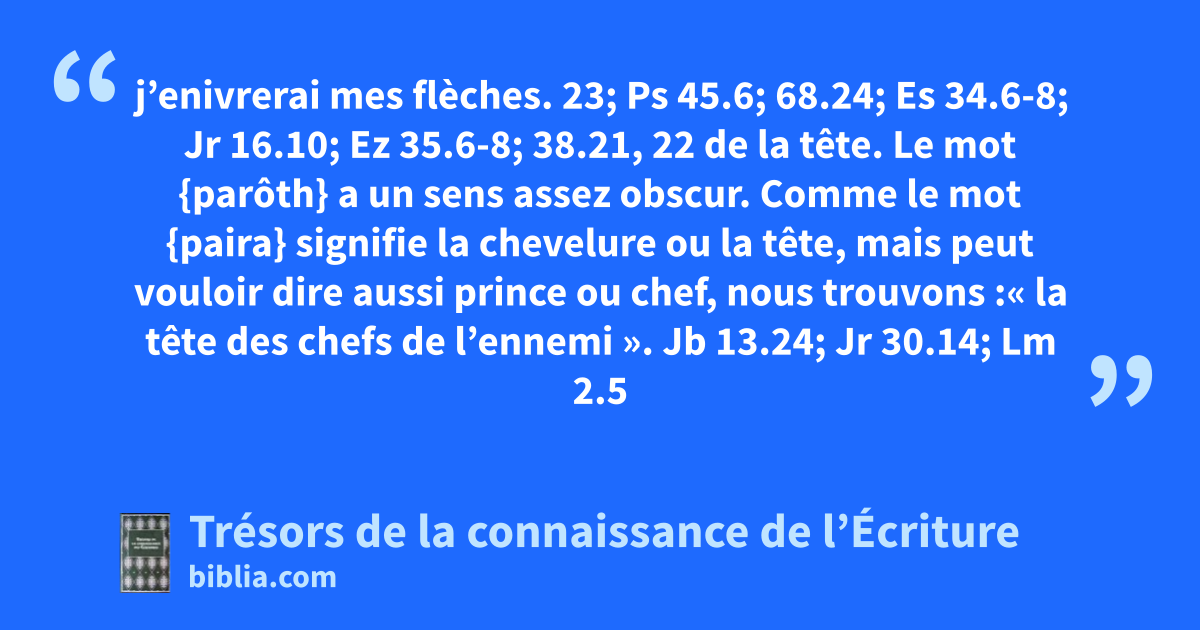 j’enivrerai mes flèches. 23; Ps 45.6; 68.24; Es 34.6-8; Jr 16.10; Ez 35.6-8; 38.21, 22 de la tête. Le mot {parôth} a un sens assez obscur. Comme le mot {paira} signifie la chevelure ou la tête, mais peut vouloir dire aussi prince ou chef, nous trouvons :« la tête des chefs de l’ennemi ». Jb 13.24; Jr 30.14; Lm 2.5