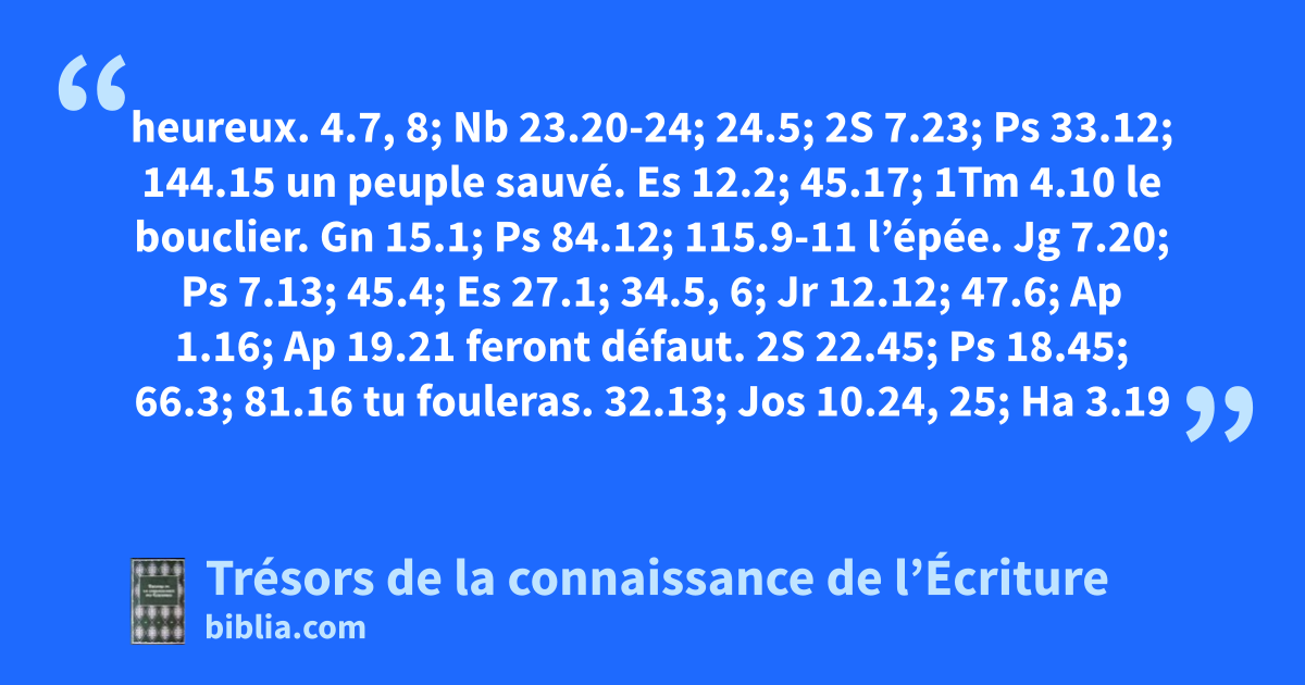 heureux. 4.7, 8; Nb 23.20-24; 24.5; 2S 7.23; Ps 33.12; 144.15 un peuple sauvé. Es 12.2; 45.17; 1Tm 4.10 le bouclier. Gn 15.1; Ps 84.12; 115.9-11 l’épée. Jg 7.20; Ps 7.13; 45.4; Es 27.1; 34.5, 6; Jr 12.12; 47.6; Ap 1.16; Ap 19.21 feront défaut. 2S 22.45; Ps 18.45; 66.3; 81.16 tu fouleras. 32.13; Jos 10.24, 25; Ha 3.19