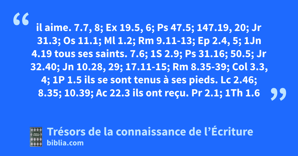 il aime. 7.7, 8; Ex 19.5, 6; Ps 47.5; 147.19, 20; Jr 31.3; Os 11.1; Ml 1.2; Rm 9.11-13; Ep 2.4, 5; 1Jn 4.19 tous ses saints. 7.6; 1S 2.9; Ps 31.16; 50.5; Jr 32.40; Jn 10.28, 29; 17.11-15; Rm 8.35-39; Col 3.3, 4; 1P 1.5 ils se sont tenus à ses pieds. Lc 2.46; 8.35; 10.39; Ac 22.3 ils ont reçu. Pr 2.1; 1Th 1.6