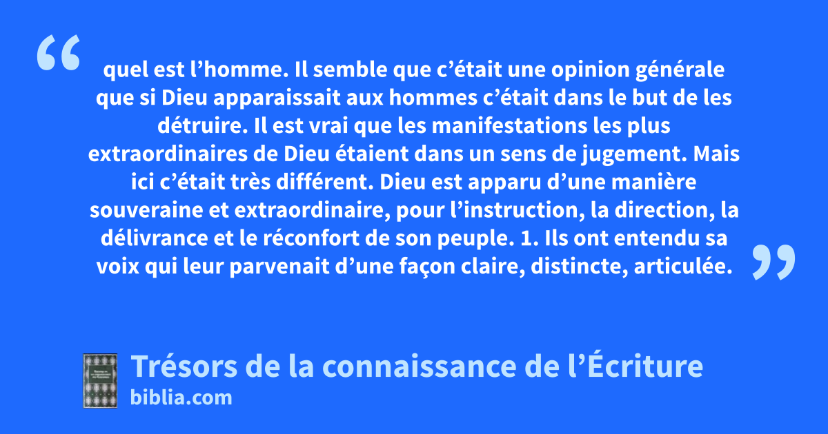 quel est l’homme. Il semble que c’était une opinion générale que si Dieu apparaissait aux hommes c’était dans le but de les détruire. Il est vrai que les manifestations les plus extraordinaires de Dieu étaient dans un sens de jugement. Mais ici c’était très différent. Dieu est apparu d’une manière souveraine et extraordinaire, pour l’instruction, la direction, la délivrance et le réconfort de son peuple. 1. Ils ont entendu sa voix qui leur parvenait d’une façon claire, distincte, articulée. 2. Ils ont vu le feu, le symbole de sa présence, qui se présentait d’une manière surnaturelle. 3. Malgré cette apparence si terrible, personne ne fut détruit car il n’était pas venu pour détruire mais pour sauver. Voir : ch. 4.33 l’homme. Ou : toute chair. Gn 6.12; Es 40.6; Rm 3.20 demeuré vivant. Jos 3.10; Ps 42.3; 84.3; Jr 10.10; Dn 6.26; Mt 26.63; Ac 14.15 2Co 6.16; 1Th 1.9