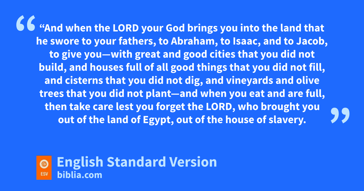 10 “And when the Lord your God brings you into the land that he swore to your fathers, to Abraham, to Isaac, and to Jacob, to give you—with great and good cities jthat you did not build, 11 and houses full of all good things that you did not fill, and cisterns that you did not dig, and vineyards and olive trees that you did not plant—and when you eat and are full, 12 kthen take care lest you forget the Lord, who brought you out of the land of Egypt, out of the house of slavery. 13 It is lthe Lord your God you shall fear. Him you shall serve and mby his name you shall swear. 14 You shall not ngo after other gods, othe gods of the peoples who are around you— 15 for pthe Lord your God in your midst qis a jealous God—rlest the anger of the Lord your God be kindled against you, and he destroy you from off the face of the earth.