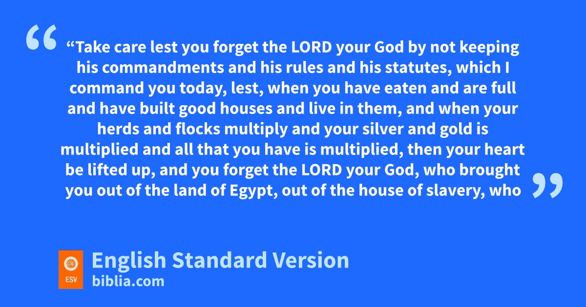11 “Take care lest you forget the Lord your God by not keeping his commandments and his rules and his statutes, which I command you today, 12 hlest, when you have eaten and are full and have built good houses and live in them, 13 and when your herds and flocks multiply and your silver and gold is multiplied and all that you have is multiplied, 14 ithen your heart be lifted up, and you jforget the Lord your God, who brought you out of the land of Egypt, out of the house of slavery, 15 who kled you through the great and terrifying wilderness, lwith its fiery serpents and scorpions mand thirsty ground where there was no water, nwho brought you water out of the flinty rock, 16 who fed you in the wilderness with omanna that your fathers did not know, that he might humble you and test you, pto do you good in the end. 17 Beware qlest you say in your heart, ‘My power and the might of my hand have gotten me this wealth.’ 18 You shall remember the Lord your God, for rit is he who gives you power to get wealth, sthat he may confirm his covenant that he swore to your fathers, as it is this day. 19 And if you forget the Lord your God and go after other gods and serve them and worship them, tI solemnly warn you today that you shall surely perish. 20 Like the nations that the Lord makes to perish before you, uso shall you perish, because you would not obey the voice of the Lord your God.