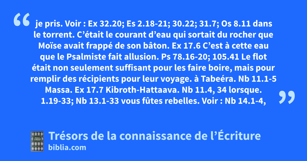 je pris. Voir : Ex 32.20; Es 2.18-21; 30.22; 31.7; Os 8.11 dans le torrent. C’était le courant d’eau qui sortait du rocher que Moïse avait frappé de son bâton. Ex 17.6 C’est à cette eau que le Psalmiste fait allusion. Ps 78.16-20; 105.41 Le flot était non seulement suffisant pour les faire boire, mais pour remplir des récipients pour leur voyage.