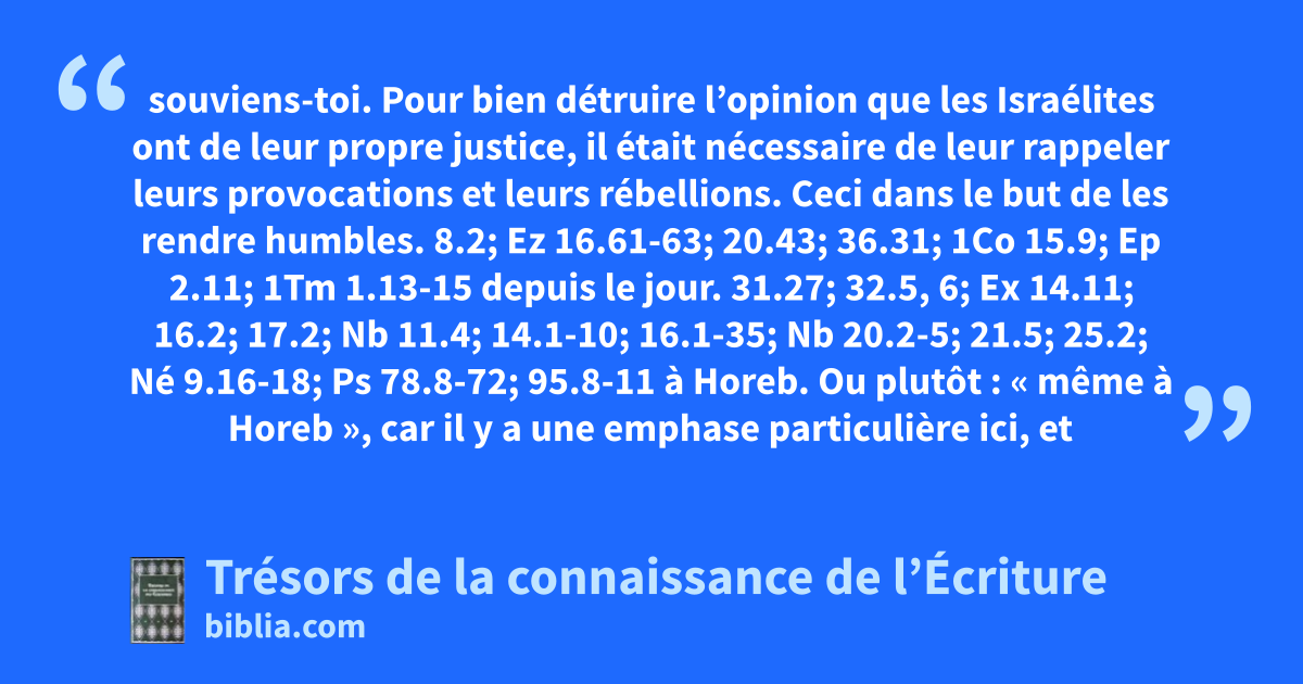 souviens-toi. Pour bien détruire l’opinion que les Israélites ont de leur propre justice, il était nécessaire de leur rappeler leurs provocations et leurs rébellions. Ceci dans le but de les rendre humbles. 8.2; Ez 16.61-63; 20.43; 36.31; 1Co 15.9; Ep 2.11; 1Tm 1.13-15 depuis le jour. 31.27; 32.5, 6; Ex 14.11; 16.2; 17.2; Nb 11.4; 14.1-10; 16.1-35; Nb 20.2-5; 21.5; 25.2; Né 9.16-18; Ps 78.8-72; 95.8-11