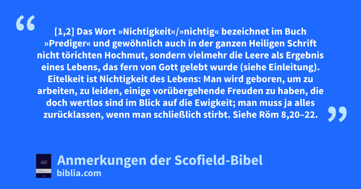 Der Prediger: Dieser Titel des Buches ist von der Übersetzung des AT in der Septuaginta übernommen worden. Manchmal wird es gemäß seinem hebräischen Titel »Kohelet« ⟨hebr.qohälät⟩ genannt. Dieses Wort besagt, dass der Verfasser ein Lehrer oder Prediger ist. Ein großer Teil des Buches ist eine Selbstbiografie; es werden Erfahrungen Salomos »des Predigers …, des Königs in Jerusalem« ⟨(1,1)⟩, wiedergegeben, die sein Thema bestätigen sollen: »… alles ist Nichtigkeit« ⟨(1,2)⟩. Unter »nichtig« versteht Salomo das, was leer ist, ohne bleibenden Wert, alles, was zur Enttäuschung führt.