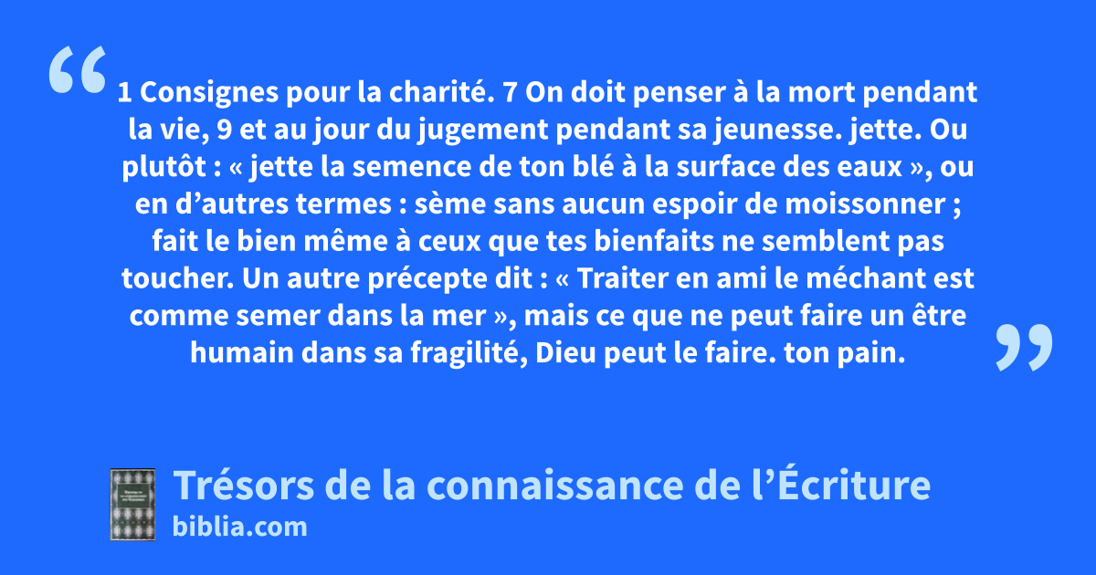 jette. Ou plutôt : « jette la semence de ton blé à la surface des eaux », ou en d’autres termes : sème sans aucun espoir de moissonner ; fait le bien même à ceux que tes bienfaits ne semblent pas toucher. Un autre précepte dit : « Traiter en ami le méchant est comme semer dans la mer », mais ce que ne peut faire un être humain dans sa fragilité, Dieu peut le faire. ton pain. Dt 15.7-11; Pr 11.24, 25; 22.9; Es 32.8 sur la face des eaux. Es 32.20 car avec le temps. 6; Dt 15.10; Ps 41.2, 3; 126.5, 6; Pr 11.18; 19.17; Mt 10.13, 42; 25.40; Lc 14.14; 2Co 9.6; Ga 6.8-10; Hé 6.10