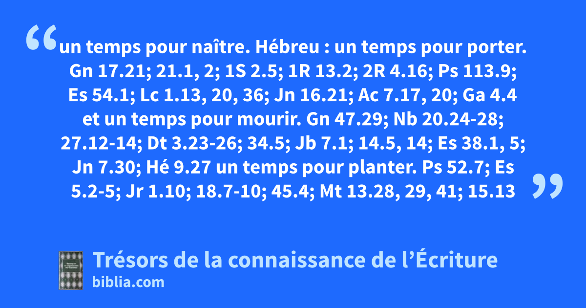 un temps pour naître. Hébreu : un temps pour porter. Gn 17.21; 21.1, 2; 1S 2.5; 1R 13.2; 2R 4.16; Ps 113.9; Es 54.1; Lc 1.13, 20, 36; Jn 16.21; Ac 7.17, 20; Ga 4.4 et un temps pour mourir. Gn 47.29; Nb 20.24-28; 27.12-14; Dt 3.23-26; 34.5; Jb 7.1; 14.5, 14; Es 38.1, 5; Jn 7.30; Hé 9.27 un temps pour planter. Ps 52.7; Es 5.2-5; Jr 1.10; 18.7-10; 45.4; Mt 13.28, 29, 41; 15.13