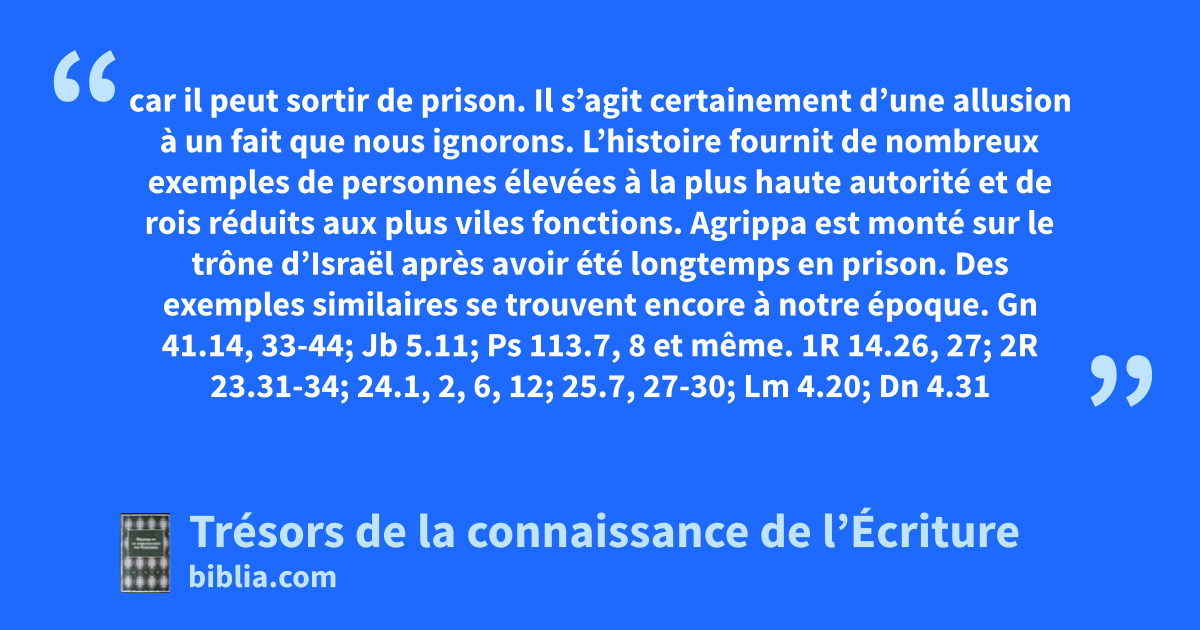 car il peut sortir de prison. Il s’agit certainement d’une allusion à un fait que nous ignorons. L’histoire fournit de nombreux exemples de personnes élevées à la plus haute autorité et de rois réduits aux plus viles fonctions. Agrippa est monté sur le trône d’Israël après avoir été longtemps en prison. Des exemples similaires se trouvent encore à notre époque. Gn 41.14, 33-44; Jb 5.11; Ps 113.7, 8 et même. 1R 14.26, 27; 2R 23.31-34; 24.1, 2, 6, 12; 25.7, 27-30; Lm 4.20; Dn 4.31