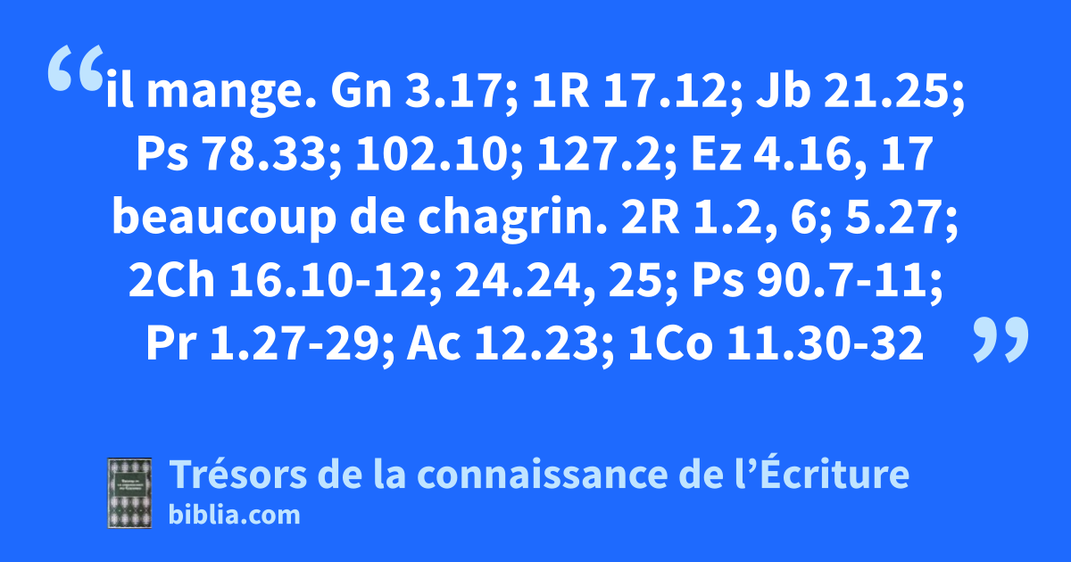il mange. Gn 3.17; 1R 17.12; Jb 21.25; Ps 78.33; 102.10; 127.2; Ez 4.16, 17 beaucoup de chagrin. 2R 1.2, 6; 5.27; 2Ch 16.10-12; 24.24, 25; Ps 90.7-11; Pr 1.27-29; Ac 12.23; 1Co 11.30-32