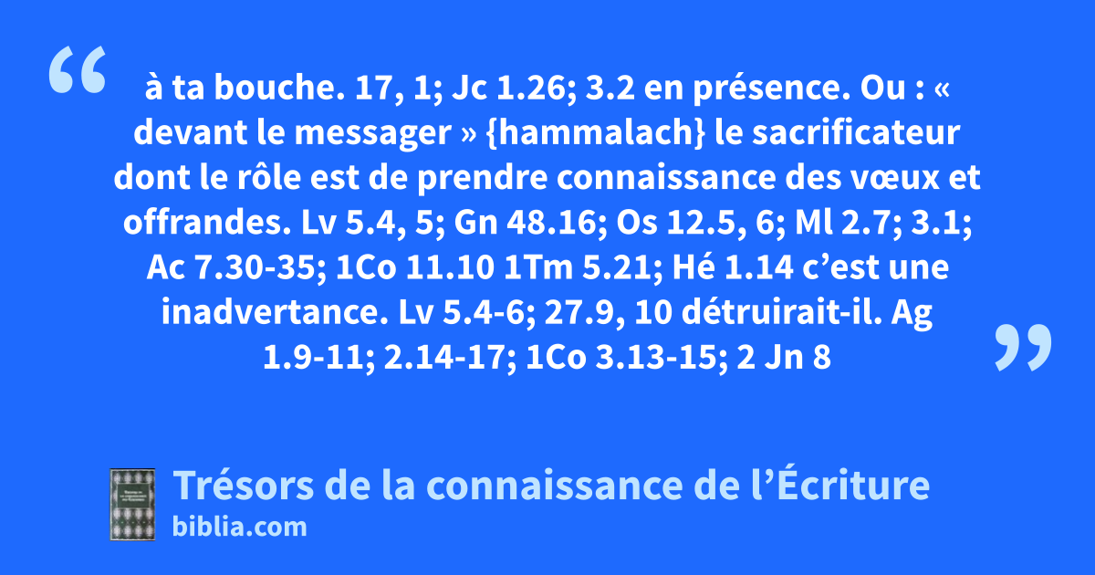 à ta bouche. 17, 1; Jc 1.26; 3.2 en présence. Ou : « devant le messager » {hammalach} le sacrificateur dont le rôle est de prendre connaissance des vœux et offrandes. Lv 5.4, 5; Gn 48.16; Os 12.5, 6; Ml 2.7; 3.1; Ac 7.30-35; 1Co 11.10 1Tm 5.21; Hé 1.14 c’est une inadvertance. Lv 5.4-6; 27.9, 10 détruirait-il. Ag 1.9-11; 2.14-17; 1Co 3.13-15; 2 Jn 8