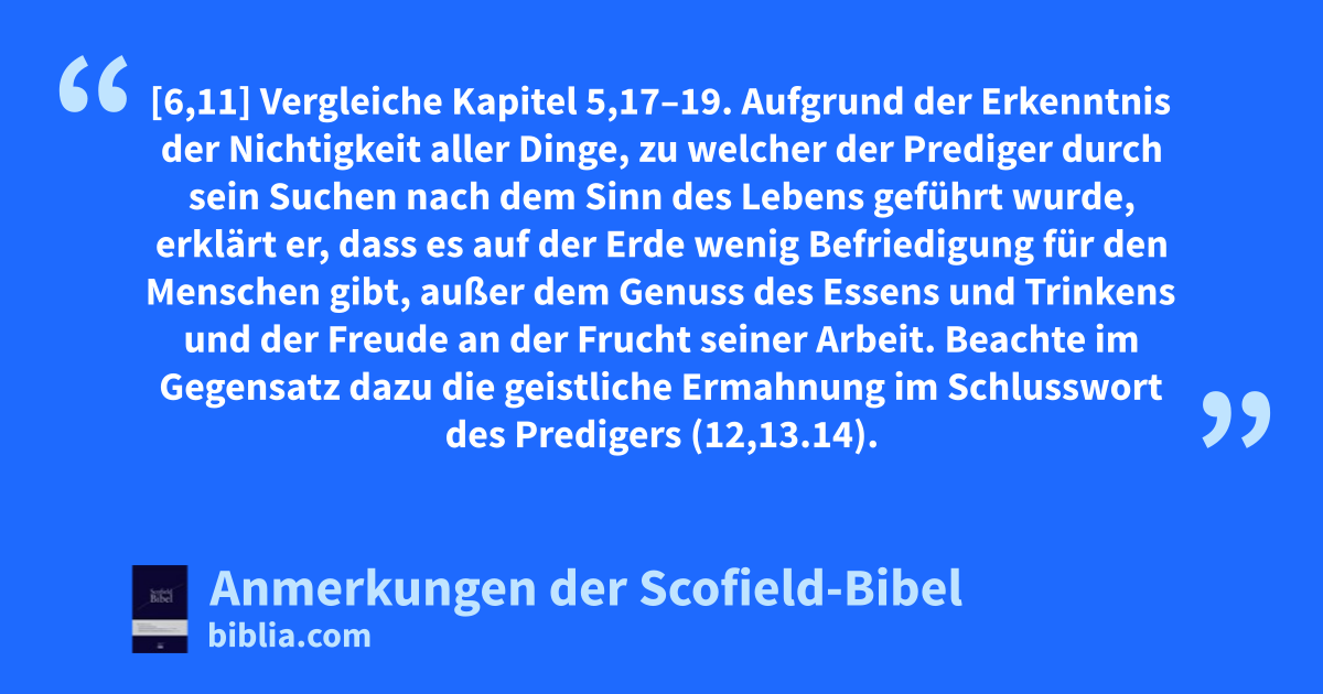 Der Prediger: Dieser Titel des Buches ist von der Übersetzung des AT in der Septuaginta übernommen worden. Manchmal wird es gemäß seinem hebräischen Titel »Kohelet« ⟨hebr.qohälät⟩ genannt. Dieses Wort besagt, dass der Verfasser ein Lehrer oder Prediger ist. Ein großer Teil des Buches ist eine Selbstbiografie; es werden Erfahrungen Salomos »des Predigers …, des Königs in Jerusalem« ⟨(1,1)⟩, wiedergegeben, die sein Thema bestätigen sollen: »… alles ist Nichtigkeit« ⟨(1,2)⟩. Unter »nichtig« versteht Salomo das, was leer ist, ohne bleibenden Wert, alles, was zur Enttäuschung führt.