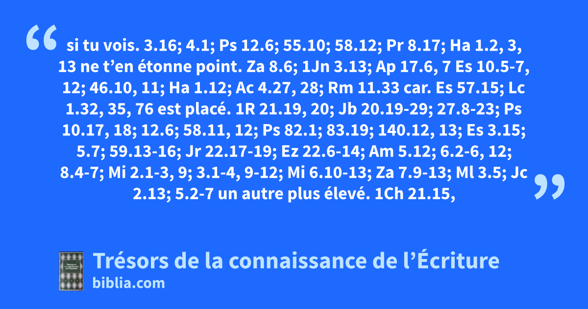 si tu vois. 3.16; 4.1; Ps 12.6; 55.10; 58.12; Pr 8.17; Ha 1.2, 3, 13 ne t’en étonne point. Za 8.6; 1Jn 3.13; Ap 17.6, 7 Es 10.5-7, 12; 46.10, 11; Ha 1.12; Ac 4.27, 28; Rm 11.33 car. Es 57.15; Lc 1.32, 35, 76 est placé. 1R 21.19, 20; Jb 20.19-29; 27.8-23; Ps 10.17, 18; 12.6; 58.11, 12; Ps 82.1; 83.19; 140.12, 13; Es 3.15; 5.7; 59.13-16; Jr 22.17-19; Ez 22.6-14; Am 5.12; 6.2-6, 12; 8.4-7; Mi 2.1-3, 9; 3.1-4, 9-12; Mi 6.10-13; Za 7.9-13; Ml 3.5; Jc 2.13; 5.2-7 un autre plus élevé. 1Ch 21.15, 16; Ps 95.3; Es 37.36; Mt 13.41, 42; Ac 12.7-10, 23