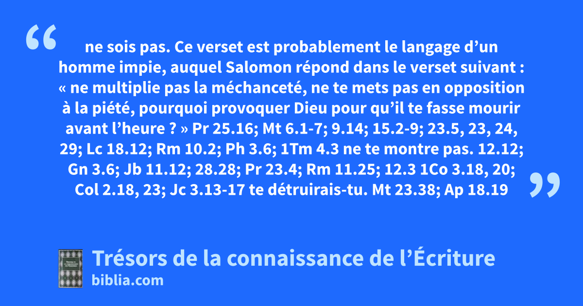 ne sois pas. Ce verset est probablement le langage d’un homme impie, auquel Salomon répond dans le verset suivant : « ne multiplie pas la méchanceté, ne te mets pas en opposition à la piété, pourquoi provoquer Dieu pour qu’il te fasse mourir avant l’heure ? » Pr 25.16; Mt 6.1-7; 9.14; 15.2-9; 23.5, 23, 24, 29; Lc 18.12; Rm 10.2; Ph 3.6; 1Tm 4.3 ne te montre pas. 12.12; Gn 3.6; Jb 11.12; 28.28; Pr 23.4; Rm 11.25; 12.3 1Co 3.18, 20; Col 2.18, 23; Jc 3.13-17 te détruirais-tu. Mt 23.38; Ap 18.19