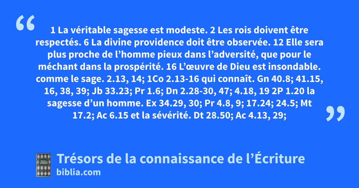 1 La véritable sagesse est modeste. 2 Les rois doivent être respectés. 6 La divine providence doit être observée. 12 Elle sera plus proche de l’homme pieux dans l’adversité, que pour le méchant dans la prospérité. 16 L’œuvre de Dieu est insondable.