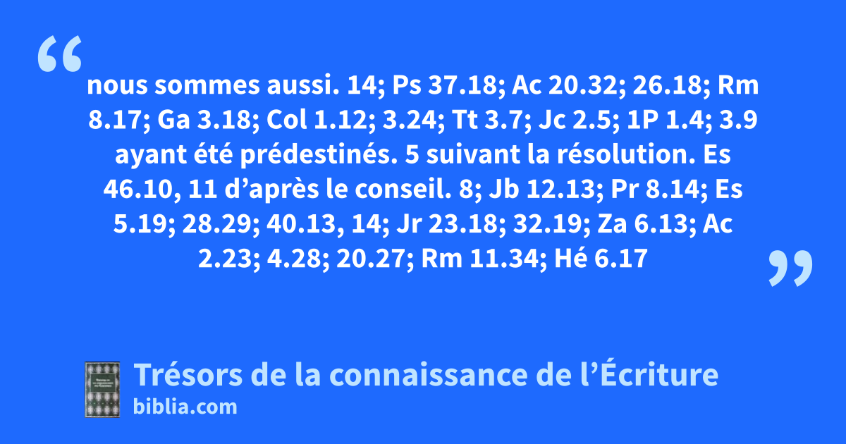 nous sommes aussi. 14; Ps 37.18; Ac 20.32; 26.18; Rm 8.17; Ga 3.18; Col 1.12; 3.24; Tt 3.7; Jc 2.5; 1P 1.4; 3.9 ayant été prédestinés. 5 suivant la résolution. Es 46.10, 11 d’après le conseil. 8; Jb 12.13; Pr 8.14; Es 5.19; 28.29; 40.13, 14; Jr 23.18; 32.19; Za 6.13; Ac 2.23; 4.28; 20.27; Rm 11.34; Hé 6.17