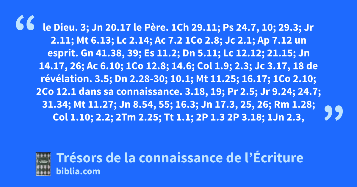 le Dieu. 3; Jn 20.17 le Père. 1Ch 29.11; Ps 24.7, 10; 29.3; Jr 2.11; Mt 6.13; Lc 2.14; Ac 7.2 1Co 2.8; Jc 2.1; Ap 7.12 un esprit. Gn 41.38, 39; Es 11.2; Dn 5.11; Lc 12.12; 21.15; Jn 14.17, 26; Ac 6.10; 1Co 12.8; 14.6; Col 1.9; 2.3; Jc 3.17, 18 de révélation. 3.5; Dn 2.28-30; 10.1; Mt 11.25; 16.17; 1Co 2.10; 2Co 12.1 dans sa connaissance. 3.18, 19; Pr 2.5; Jr 9.24; 24.7; 31.34; Mt 11.27; Jn 8.54, 55; 16.3; Jn 17.3, 25, 26; Rm 1.28; Col 1.10; 2.2; 2Tm 2.25; Tt 1.1; 2P 1.3 2P 3.18; 1Jn 2.3, 4