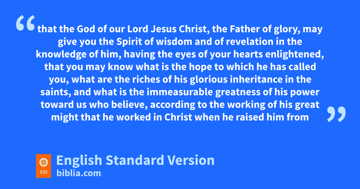 15 For this reason, mbecause I have heard of your faith in the Lord Jesus and your love7 toward all the saints, 16 I ndo not cease to give thanks for you, oremembering you in my prayers, 17 that pthe God of our Lord Jesus Christ, the Father of glory, qmay give you the Spirit of wisdom and of revelation in the knowledge of him, 18 rhaving the eyes of your hearts enlightened, that you may know what is sthe hope to which he has called you, what are tthe riches of his glorious inheritance in the saints, 19 and what is the immeasurable greatness of his power toward us who believe, uaccording to the working of vhis great might 20 that he worked in Christ wwhen he raised him from the dead and xseated him at his right hand yin the heavenly places, 21 zfar above aall rule and authority and power and dominion, and above bevery name that is named, not only in cthis age but also in the one to come. 22 And dhe put all things under his feet and gave him as ehead over all things to the church, 23 fwhich is his body, gthe fullness of him hwho fills iall in all.