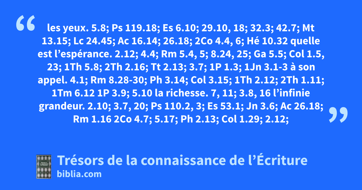 les yeux. 5.8; Ps 119.18; Es 6.10; 29.10, 18; 32.3; 42.7; Mt 13.15; Lc 24.45; Ac 16.14; 26.18; 2Co 4.4, 6; Hé 10.32 quelle est l’espérance. 2.12; 4.4; Rm 5.4, 5; 8.24, 25; Ga 5.5; Col 1.5, 23; 1Th 5.8; 2Th 2.16; Tt 2.13; 3.7; 1P 1.3; 1Jn 3.1-3 à son appel. 4.1; Rm 8.28-30; Ph 3.14; Col 3.15; 1Th 2.12; 2Th 1.11; 1Tm 6.12 1P 3.9; 5.10 la richesse. 7, 11; 3.8, 16