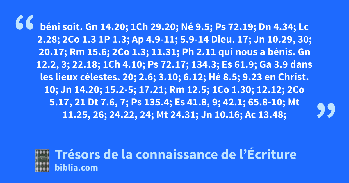 béni soit. Gn 14.20; 1Ch 29.20; Né 9.5; Ps 72.19; Dn 4.34; Lc 2.28; 2Co 1.3 1P 1.3; Ap 4.9-11; 5.9-14 Dieu. 17; Jn 10.29, 30; 20.17; Rm 15.6; 2Co 1.3; 11.31; Ph 2.11 qui nous a bénis. Gn 12.2, 3; 22.18; 1Ch 4.10; Ps 72.17; 134.3; Es 61.9; Ga 3.9 dans les lieux célestes. 20; 2.6; 3.10; 6.12; Hé 8.5; 9.23 en Christ. 10; Jn 14.20; 15.2-5; 17.21; Rm 12.5; 1Co 1.30; 12.12; 2Co 5.17, 21