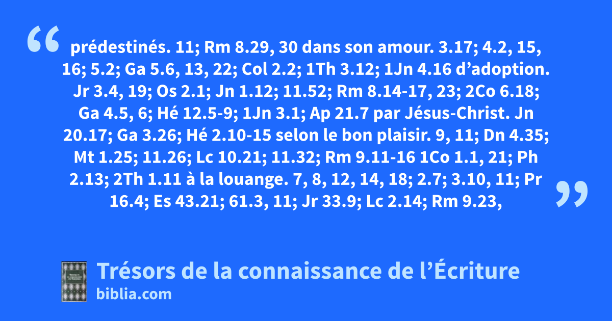 prédestinés. 11; Rm 8.29, 30 dans son amour. 3.17; 4.2, 15, 16; 5.2; Ga 5.6, 13, 22; Col 2.2; 1Th 3.12; 1Jn 4.16 d’adoption. Jr 3.4, 19; Os 2.1; Jn 1.12; 11.52; Rm 8.14-17, 23; 2Co 6.18; Ga 4.5, 6; Hé 12.5-9; 1Jn 3.1; Ap 21.7 par Jésus-Christ. Jn 20.17; Ga 3.26; Hé 2.10-15 selon le bon plaisir. 9, 11; Dn 4.35; Mt 1.25; 11.26; Lc 10.21; 11.32; Rm 9.11-16 1Co 1.1, 21; Ph 2.13; 2Th 1.11
