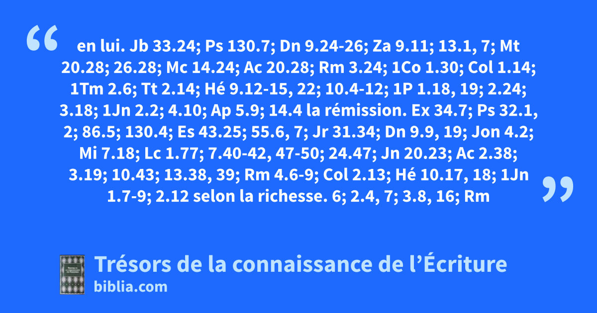 en lui. Jb 33.24; Ps 130.7; Dn 9.24-26; Za 9.11; 13.1, 7; Mt 20.28; 26.28; Mc 14.24; Ac 20.28; Rm 3.24; 1Co 1.30; Col 1.14; 1Tm 2.6; Tt 2.14; Hé 9.12-15, 22; 10.4-12; 1P 1.18, 19; 2.24; 3.18; 1Jn 2.2; 4.10; Ap 5.9; 14.4 la rémission. Ex 34.7; Ps 32.1, 2; 86.5; 130.4; Es 43.25; 55.6, 7; Jr 31.34; Dn 9.9, 19; Jon 4.2; Mi 7.18; Lc 1.77; 7.40-42, 47-50; 24.47; Jn 20.23; Ac 2.38; 3.19; 10.43; 13.38, 39; Rm 4.6-9; Col 2.13; Hé 10.17, 18; 1Jn 1.7-9; 2.12 selon la richesse. 6; 2.4, 7; 3.8, 16; Rm 2.4; 3.24; 9.23; 2Co 8.9; Ph 4.19; Col 1.27; 2.2; Tt 3.6