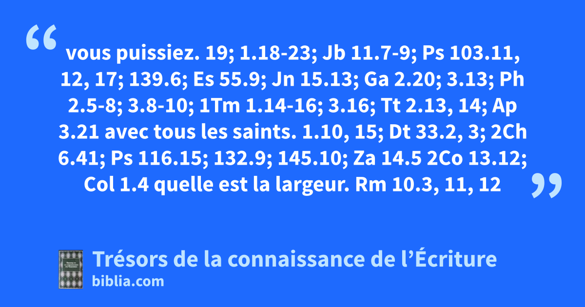vous puissiez. 19; 1.18-23; Jb 11.7-9; Ps 103.11, 12, 17; 139.6; Es 55.9; Jn 15.13; Ga 2.20; 3.13; Ph 2.5-8; 3.8-10; 1Tm 1.14-16; 3.16; Tt 2.13, 14; Ap 3.21 avec tous les saints. 1.10, 15; Dt 33.2, 3; 2Ch 6.41; Ps 116.15; 132.9; 145.10; Za 14.5 2Co 13.12; Col 1.4 quelle est la largeur. Rm 10.3, 11, 12