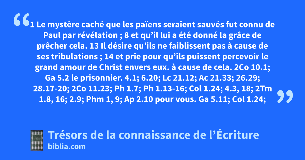 1 Le mystère caché que les païens seraient sauvés fut connu de Paul par révélation ; 8 et qu’il lui a été donné la grâce de prêcher cela. 13 Il désire qu’ils ne faiblissent pas à cause de ses tribulations ; 14 et prie pour qu’ils puissent percevoir le grand amour de Christ envers eux.