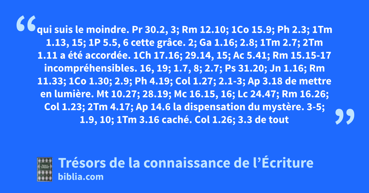 qui suis le moindre. Pr 30.2, 3; Rm 12.10; 1Co 15.9; Ph 2.3; 1Tm 1.13, 15; 1P 5.5, 6 cette grâce. 2; Ga 1.16; 2.8; 1Tm 2.7; 2Tm 1.11 a été accordée. 1Ch 17.16; 29.14, 15; Ac 5.41; Rm 15.15-17 incompréhensibles. 16, 19; 1.7, 8; 2.7; Ps 31.20; Jn 1.16; Rm 11.33; 1Co 1.30; 2.9; Ph 4.19; Col 1.27; 2.1-3; Ap 3.18