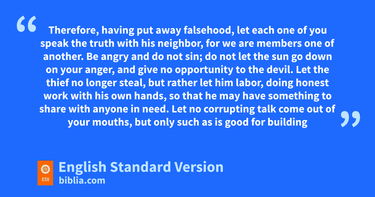 25 Therefore, having put away falsehood, let each one of you uspeak the truth with his neighbor, for vwe are members one of another. 26 wBe angry and do not sin; do not let the sun go down on your anger, 27 and xgive no opportunity to the devil. 28 Let the thief no longer steal, but rather ylet him labor, zdoing honest work with his own hands, so athat he may have something to share with anyone in need. 29 bLet no corrupting talk come out of your mouths, but only such as is good for building up, as fits the occasion, that it may give cgrace to those who hear. 30 And ddo not grieve the Holy Spirit of God, eby whom you were sealed for the day of fredemption. 31 gLet all bitterness and wrath and anger and clamor and slander be put away from you, along with all malice. 32 hBe kind to one another, tenderhearted, iforgiving one another, as God in Christ forgave you.