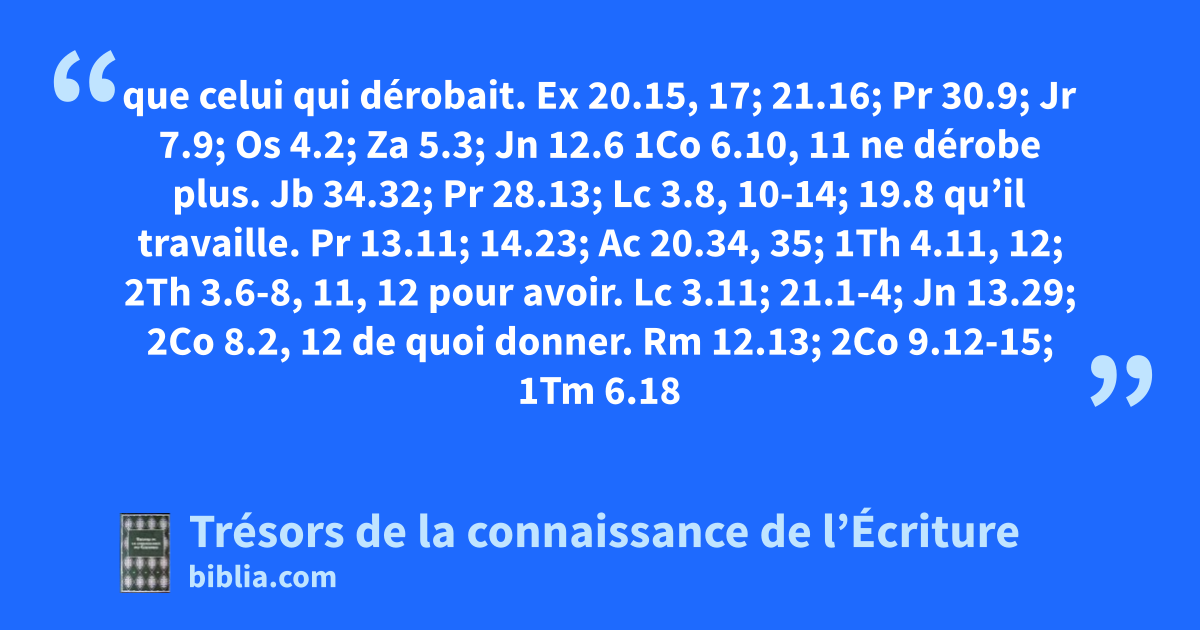 que celui qui dérobait. Ex 20.15, 17; 21.16; Pr 30.9; Jr 7.9; Os 4.2; Za 5.3; Jn 12.6 1Co 6.10, 11 ne dérobe plus. Jb 34.32; Pr 28.13; Lc 3.8, 10-14; 19.8 qu’il travaille. Pr 13.11; 14.23; Ac 20.34, 35; 1Th 4.11, 12; 2Th 3.6-8, 11, 12 pour avoir. Lc 3.11; 21.1-4; Jn 13.29; 2Co 8.2, 12 de quoi donner. Rm 12.13; 2Co 9.12-15; 1Tm 6.18