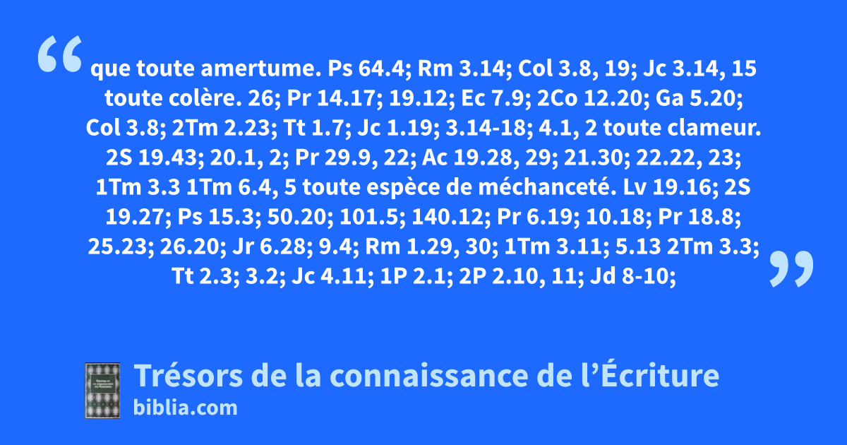 que toute amertume. Ps 64.4; Rm 3.14; Col 3.8, 19; Jc 3.14, 15 toute colère. 26; Pr 14.17; 19.12; Ec 7.9; 2Co 12.20; Ga 5.20; Col 3.8; 2Tm 2.23; Tt 1.7; Jc 1.19; 3.14-18; 4.1, 2 toute clameur. 2S 19.43; 20.1, 2; Pr 29.9, 22; Ac 19.28, 29; 21.30; 22.22, 23; 1Tm 3.3 1Tm 6.4, 5 toute espèce de méchanceté. Lv 19.16; 2S 19.27; Ps 15.3; 50.20; 101.5; 140.12; Pr 6.19; 10.18; Pr 18.8; 25.23; 26.20; Jr 6.28; 9.4; Rm 1.29, 30; 1Tm 3.11; 5.13 2Tm 3.3; Tt 2.3; 3.2; Jc 4.11; 1P 2.1; 2P 2.10, 11; Jd 8-10; Ap 12.10 disparaisse. Gn 4.8; 27.41; 37.4, 21; Lv 19.17, 18; 2S 13.22; Pr 10.12; 26.24, 25; Ec 7.9; Rm 1.29; 1Co 5.8; 14.20; Col 3.8; Tt 3.3; 1Jn 3.12, 15