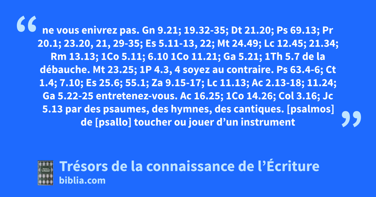 ne vous enivrez pas. Gn 9.21; 19.32-35; Dt 21.20; Ps 69.13; Pr 20.1; 23.20, 21, 29-35; Es 5.11-13, 22; Mt 24.49; Lc 12.45; 21.34; Rm 13.13; 1Co 5.11; 6.10 1Co 11.21; Ga 5.21; 1Th 5.7 de la débauche. Mt 23.25; 1P 4.3, 4 soyez au contraire. Ps 63.4-6; Ct 1.4; 7.10; Es 25.6; 55.1; Za 9.15-17; Lc 11.13; Ac 2.13-18; 11.24; Ga 5.22-25