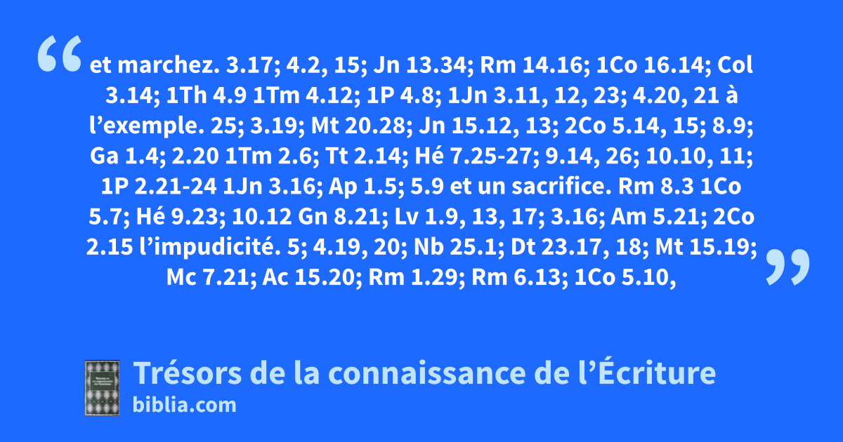et marchez. 3.17; 4.2, 15; Jn 13.34; Rm 14.16; 1Co 16.14; Col 3.14; 1Th 4.9 1Tm 4.12; 1P 4.8; 1Jn 3.11, 12, 23; 4.20, 21 à l’exemple. 25; 3.19; Mt 20.28; Jn 15.12, 13; 2Co 5.14, 15; 8.9; Ga 1.4; 2.20 1Tm 2.6; Tt 2.14; Hé 7.25-27; 9.14, 26; 10.10, 11; 1P 2.21-24 1Jn 3.16; Ap 1.5; 5.9 et un sacrifice. Rm 8.3 1Co 5.7; Hé 9.23; 10.12 Gn 8.21; Lv 1.9, 13, 17; 3.16; Am 5.21; 2Co 2.15