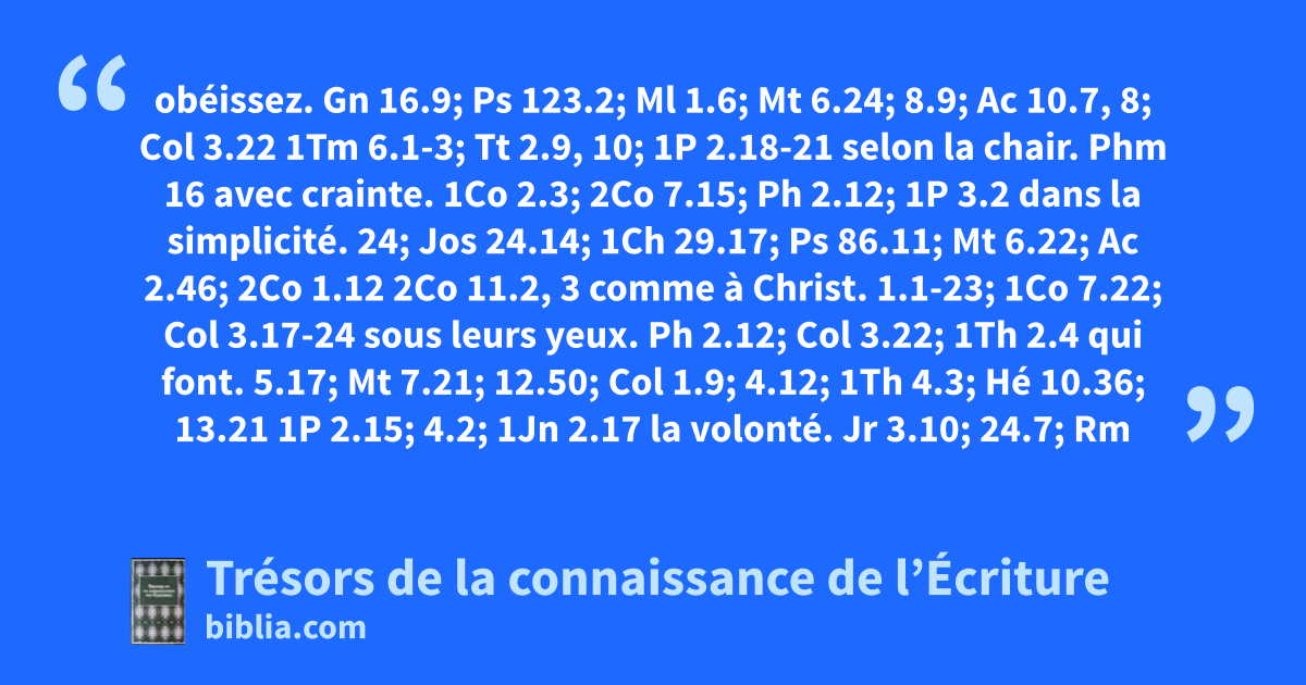 obéissez. Gn 16.9; Ps 123.2; Ml 1.6; Mt 6.24; 8.9; Ac 10.7, 8; Col 3.22 1Tm 6.1-3; Tt 2.9, 10; 1P 2.18-21 selon la chair. Phm 16 avec crainte. 1Co 2.3; 2Co 7.15; Ph 2.12; 1P 3.2 dans la simplicité. 24; Jos 24.14; 1Ch 29.17; Ps 86.11; Mt 6.22; Ac 2.46; 2Co 1.12 2Co 11.2, 3 comme à Christ. 1.1-23; 1Co 7.22; Col 3.17-24