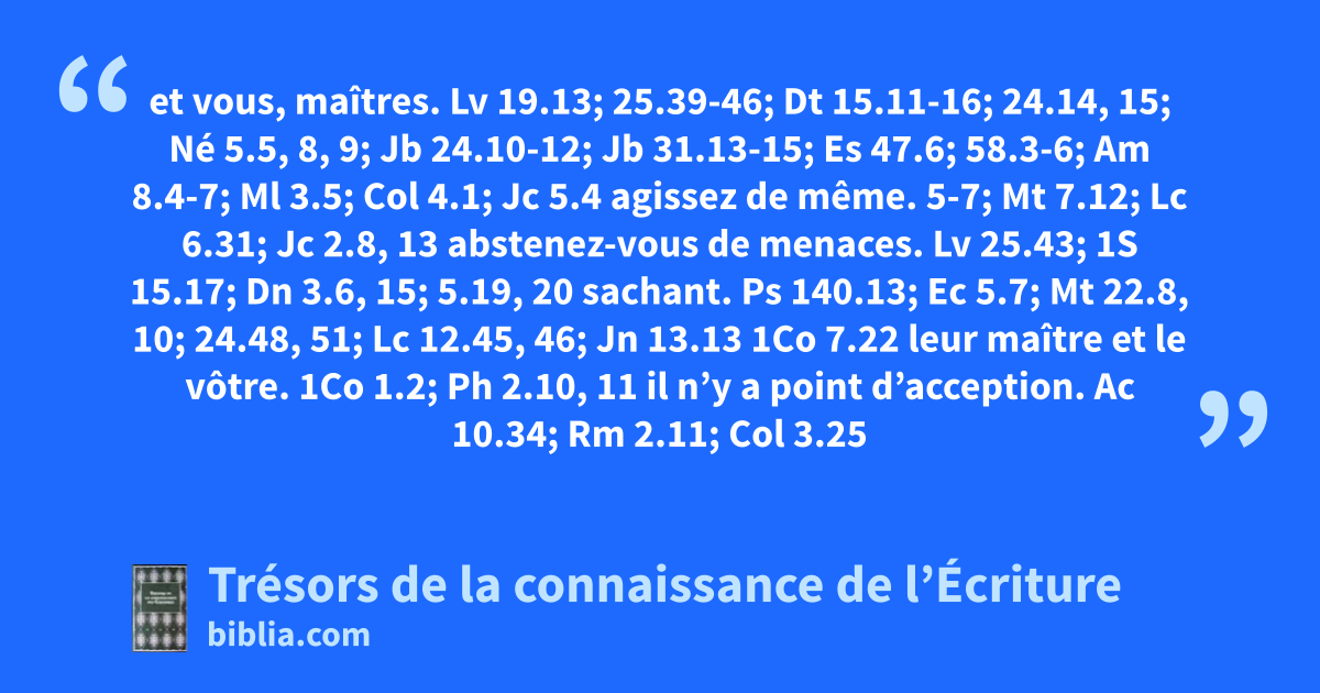 et vous, maîtres. Lv 19.13; 25.39-46; Dt 15.11-16; 24.14, 15; Né 5.5, 8, 9; Jb 24.10-12; Jb 31.13-15; Es 47.6; 58.3-6; Am 8.4-7; Ml 3.5; Col 4.1; Jc 5.4 agissez de même. 5-7; Mt 7.12; Lc 6.31; Jc 2.8, 13 abstenez-vous de menaces. Lv 25.43; 1S 15.17; Dn 3.6, 15; 5.19, 20 sachant. Ps 140.13; Ec 5.7; Mt 22.8, 10; 24.48, 51; Lc 12.45, 46; Jn 13.13 1Co 7.22 leur maître et le vôtre. 1Co 1.2; Ph 2.10, 11 il n’y a point d’acception. Ac 10.34; Rm 2.11; Col 3.25