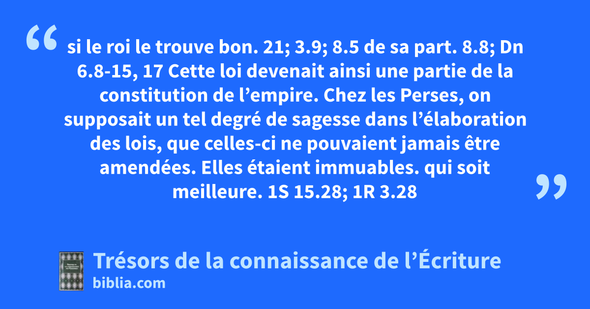 si le roi le trouve bon. 21; 3.9; 8.5 de sa part. 8.8; Dn 6.8-15, 17 Cette loi devenait ainsi une partie de la constitution de l’empire. Chez les Perses, on supposait un tel degré de sagesse dans l’élaboration des lois, que celles-ci ne pouvaient jamais être amendées. Elles étaient immuables. qui soit meilleure. 1S 15.28; 1R 3.28