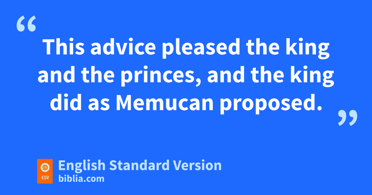 13 Then the king said to lthe wise men mwho knew the times (for this was the king’s procedure toward all who were versed in law and judgment, 14 the men next to him being Carshena, Shethar, Admatha, Tarshish, Meres, Marsena, and nMemucan, othe seven princes of Persia and Media, pwho saw the king’s face, and sat first in the kingdom): 15 “According to the law, what is to be done to Queen Vashti, because she has not performed the command of King Ahasuerus delivered by the eunuchs?” 16 Then Memucan said in the presence of the king and the officials, “Not only against the king has Queen Vashti done wrong, but also against all the officials and all the peoples who are in all the provinces of King Ahasuerus. 17 For the queen’s behavior will be made known to all women, causing them to look at their husbands with contempt,3 since they will say, ‘King Ahasuerus commanded Queen Vashti to be brought before him, and she did not come.’ 18 This very day the noble women of Persia and Media who have heard of the queen’s behavior will say the same to all the king’s officials, and there will be contempt and wrath in plenty. 19 If it please the king, let a royal order go out from him, and let it be written among the laws of the Persians and the Medes so qthat it may not be repealed, that Vashti is never again to come before King Ahasuerus. And let the king give her royal position to another who is better than she. 20 So when the decree made by the king is proclaimed throughout all his kingdom, for it is vast, rall women will give honor to their husbands, high and low alike.” 21 This advice pleased the king and the princes, and the king did as Memucan proposed. 22 He sent letters to all the royal provinces, sto every province in its own script and to every people in its own language, that every man be master in his own household and speak according to the language of his people.