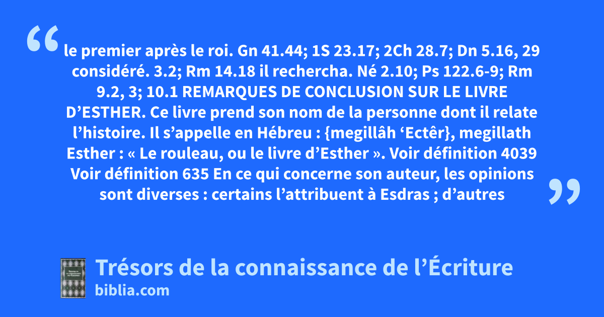 Ce livre prend son nom de la personne dont il relate l’histoire. Il s’appelle en Hébreu : {megillâh ‘Ectêr}, megillath Esther : « Le rouleau, ou le livre d’Esther ». Voir définition 4039 Voir définition 635 En ce qui concerne son auteur, les opinions sont diverses : certains l’attribuent à Esdras ; d’autres à Joachim, le fils de Josué le souverain sacrificateur ; d’autres aux responsables de la grande synagogue, et d’autres encore à Mardochée, ce qui semble le plus probable. Les événements relatés se réfèrent probablement à l’époque d’Artaxercès Longimanus, qui, selon de nombreux avis autorisés était le Assuérus d’Esther. L’histoire se place entre les chapitres Esd 6.1-22 et 7.1-28 d’Esdras, se déroulant sur une douzaine d’années. Elle relate la fête royale donnée par Assuérus ; la disgrâce de Vasthi, (ch. Est 1.1-22) ; l’élévation au trône d’Esther ; le grand service rendu au roi par Mardochée, en découvrant un complot contre sa vie, (ch. 2.1-23) ; la promotion d’Haman, et son dessein de détruire les Juifs, (ch. 3.1-15). Puis la désolation des Juifs, et les mesures qu’ils prennent, (ch. 4.1-17) ; l’échec du complot d’Haman contre Mardochée, à travers l’action d’Esther, (ch. 5.1-7.10). Puis l’échec général du complot contre les Juifs, (ch. 8.1 à 9.15) et l’institution de la fête du Purim pour commémorer cette délivrance, (ch. 9.16-32) et l’élévation de Mardochée, (ch. 10.1-3). Bien que certains chrétiens aient hésité à admettre ce livre dans le canon des livres sacrés, il a toujours été reconnu par les Juifs, non seulement comme parfaitement authentique, mais comme un livre des plus parfaits. C’est une véritable et fidèle description de faits réels, et l’observation de la fête du Purim encore de nos jours en est une évidence. Il serait en effet assez inconcevable qu’une nation puisse instituer, et continuer à célébrer sans interruption, à travers les âges, et en tous lieux, une fête qui serait fondée sur une simple fable, même agréable. Il a été fait la remarque, sur ce livre, que le nom de Dieu n’y figure pas, mais cependant sa remarquable providence y est bien souvent démontrée. Cette providence se rencontre à chaque passage de cette œuvre : elle découvre les mauvais desseins, et amène de grands événements, par des moyens qui peuvent sembler étranges. Ce livre présente une description intéressante de l’orgueil mortifié, de la malice qui se retourne pour détruire ceux qui veulent l’utiliser, et nous trouvons là une vivante illustration des vexations, des troubles, des anxiétés, des mensonges et de la dissimulation d’une cour corrompue.