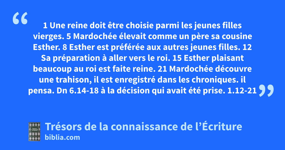 1 Une reine doit être choisie parmi les jeunes filles vierges. 5 Mardochée élevait comme un père sa cousine Esther. 8 Esther est préférée aux autres jeunes filles. 12 Sa préparation à aller vers le roi. 15 Esther plaisant beaucoup au roi est faite reine. 21 Mardochée découvre une trahison, il est enregistré dans les chroniques.