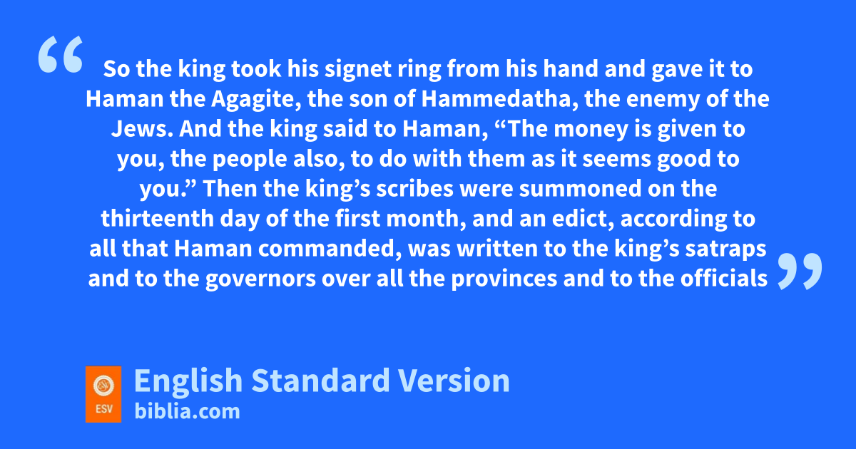 7 In the first month, which is the month of Nisan, in the twelfth year of King Ahasuerus, xthey cast Pur (that is, they cast lots) before Haman day after day; and they cast it month after month till the twelfth month, which is ythe month of Adar. 8 Then Haman said to King Ahasuerus, “There is a certain people scattered abroad and dispersed among the peoples in all the provinces of your kingdom. zTheir laws are different from those of every other people, and they do not keep the king’s laws, so that it is not to the king’s profit to tolerate them. 9 If it please the king, let it be decreed that they be destroyed, and I will pay 10,000 talents3 of silver into the hands of those who have charge of the king’s business, that they may put it into the king’s treasuries.” 10 aSo the king took his signet ring from his hand and gave it to Haman bthe Agagite, the son of Hammedatha, cthe enemy of the Jews. 11 And the king said to Haman, “The money is given to you, the people also, to do with them as it seems good to you.”